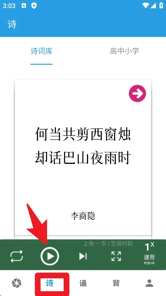 2. 在诗页面选择诗词库,点击播放键即可听取朗诵内容,帮助练习语感和发音技巧。
