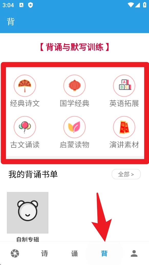 4. 进入背页面开展背诵训练,可选择经典诗文或国学经典进行学习,并搭配默写练习来强化记忆效果。