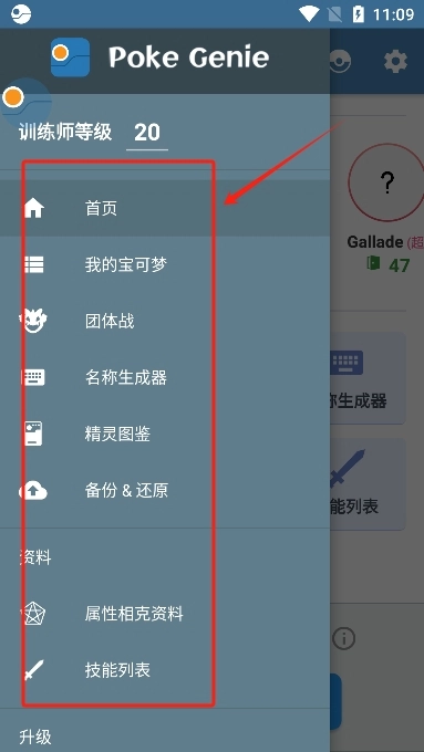 4、点击左上角的菜单栏,可以找到团体站、属性相克资料等工具。