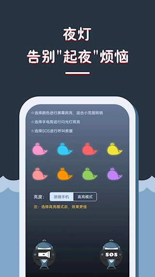 4、整合了多种实用工具模块,像可自定义的电子时钟、低亮度夜灯以及SOS应急信号灯都包含在内。同时支持屏幕常亮显示和亮度的分级调节功能。