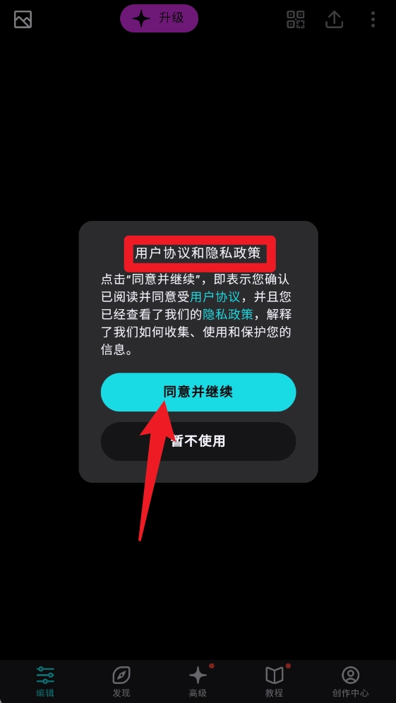 1、第一次打开泼辣修图应用时,需要阅读并同意《用户协议和隐私政策》,点击同意并继续就能进入应用。