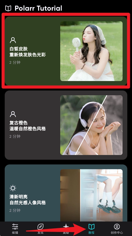 5、在教程栏目,你可以学习各类风格的修图技巧,像打造白皙皮肤、调出复古橙色色调、制作清新光感人像等都包含在内。