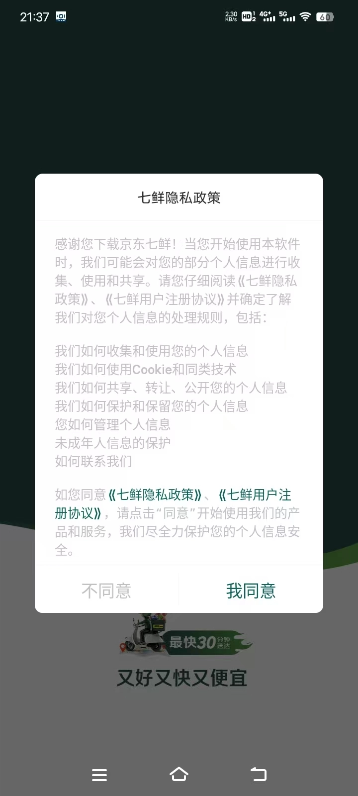 1、打开安装好的生鲜超市 ,页面弹出协议窗口后点击 “我同意”。