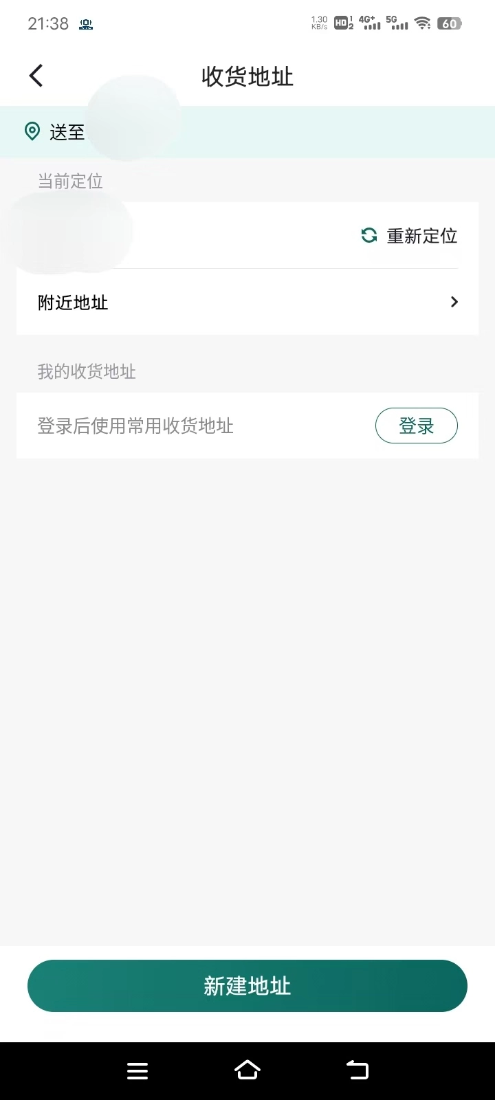 2、点击 “重新定位”,再选择 “新建地址”,按页面提示填写完整位置信息。
