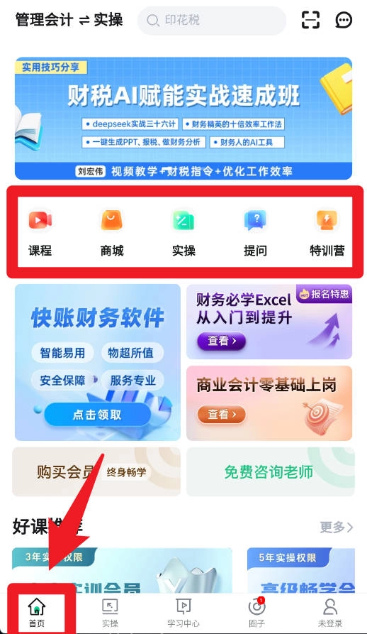 2、进入首页后,你可以在课程、商城、实操、提问、特训营等功能板块开展学习与操作,以此满足多样化的需求。