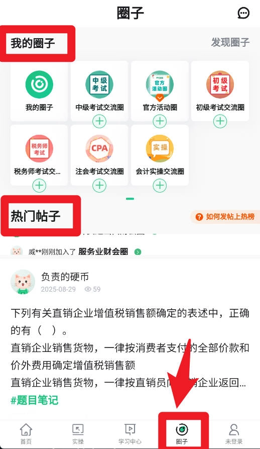 5、在圈子板块,你可以加入各类考试交流圈,也能浏览热门帖子,与行业内的伙伴互动交流,从而获得答疑解惑和经验分享的机会。