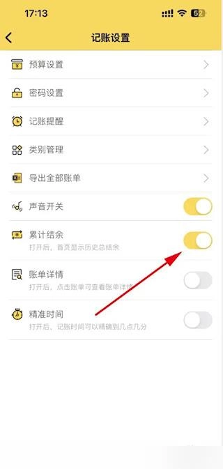 3、于设置项目列表中定位累计结余功能项,点击右侧开关按钮激活该功能。