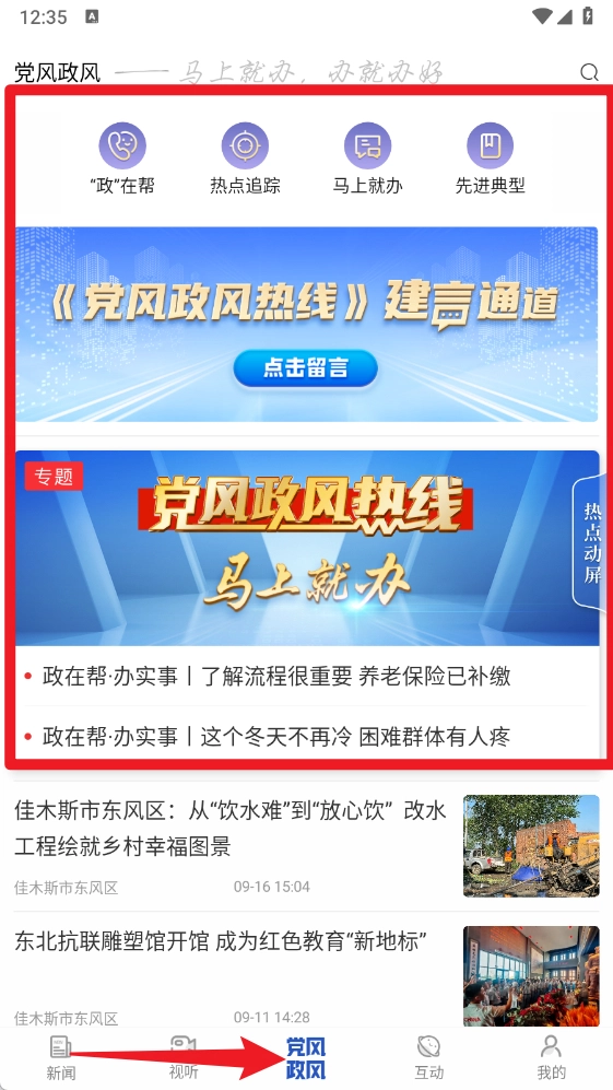4、点击底部菜单中的“贞风政风”选项,即可浏览政务热线、政策解读、民生资讯等相关内容,同时还能进行留言互动。