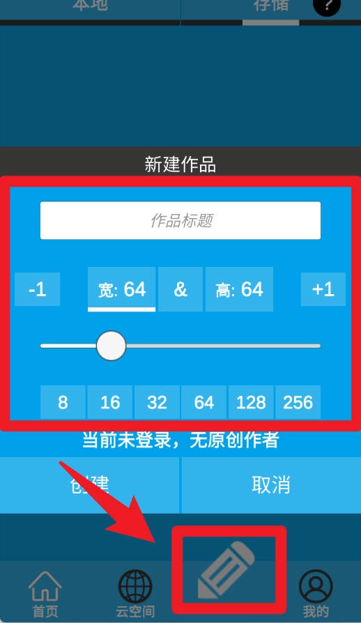 4、点击底部的画笔图标来新建作品,输入标题后,再设置好画布的宽高以及像素大小,就能开启全新的绘制创作了。
