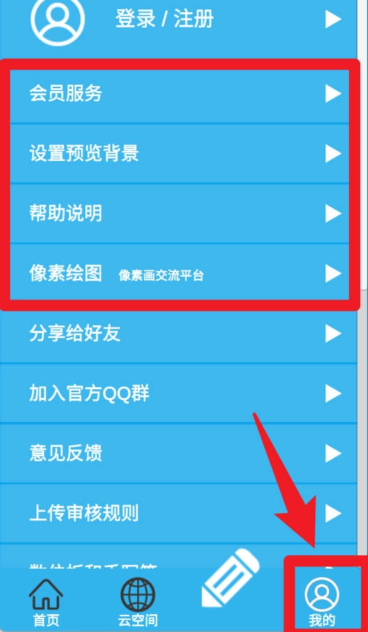 5、在个人中心页面,用户可以进入会员服务、帮助说明、背景设置等功能区域,还能加入像素绘画交流平台,与其他爱好者进行互动交流。