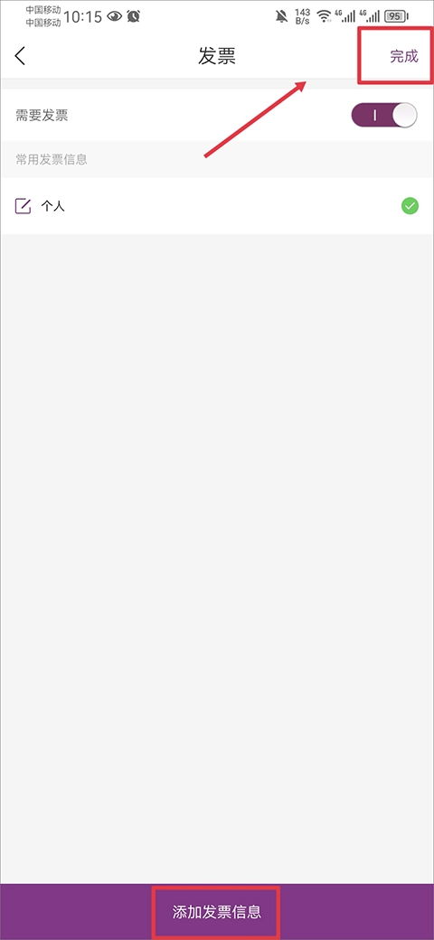 5、若是个人开票可以直接点击右上角完成,若是企业开票则需要点击下方添加发票信息