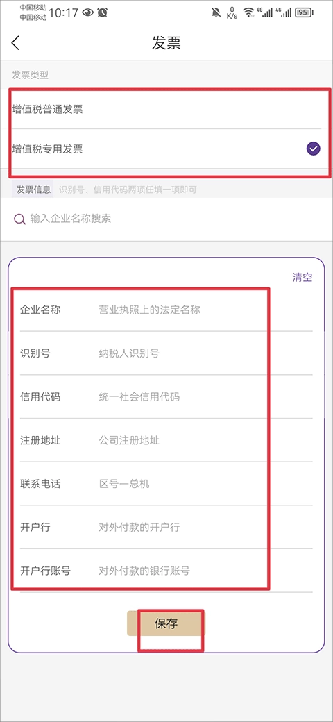6、然后选择发票类型并将企业名称、识别号、信用代码、注册地址、联系电话、开户行、开户行账号信息完善后点击保存