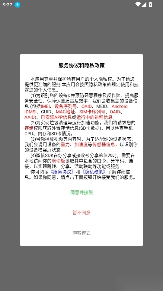 1.打开软件阅读“服务协议和隐私政策”点击“同意并接受”进入