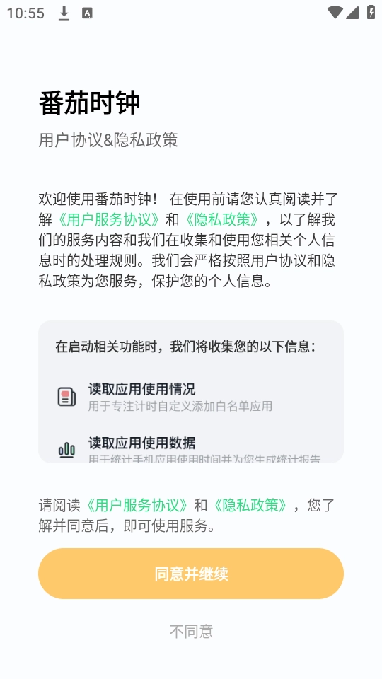 1、在本站番茄时钟 ,完成安装后打开软件,按照界面提示同意用户协议,即可进入主功能界面;