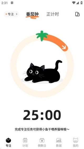 1、安装喵喵自律器并进入软件后,即可开启专注模式,该模式具备番茄钟与正计时功能。