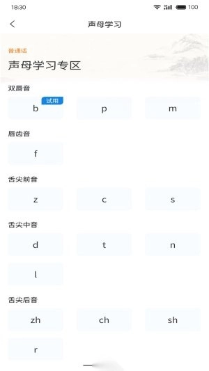 3.点击拼音学习,App提供声、韵、调三方面字词拼音学习及评测功能