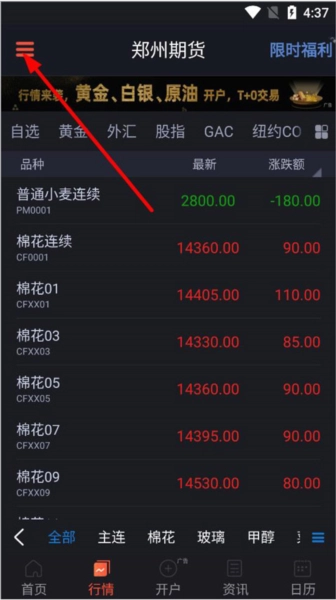 2、打开行情页面后,能看到黄金、外汇、股指、自选、GAC等板块,接着点击左上角的图标。