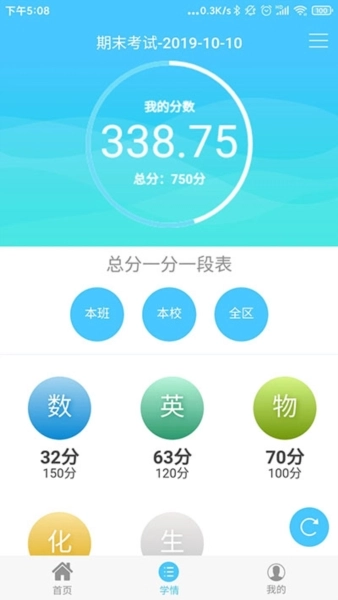 4、登录后,点击底部【学情】菜单,就可以查看到各科的成绩,示例如图。