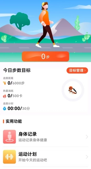 点击运动模块后,系统会实时记录当日的运动步数,同时支持设置步数目标。