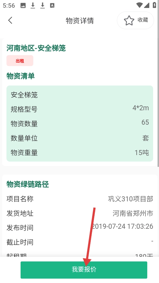 4、在【河南地区-安全梯笼】物资详情页,点击【我要报价】可参与该物资租赁报价。