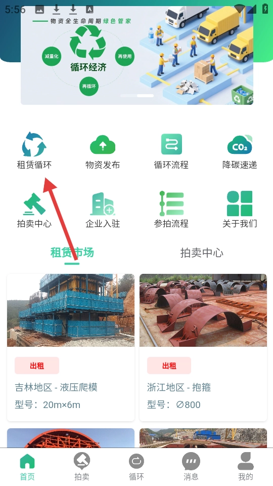 2、进入应用首页,点击【租赁循环】选项,可进入租赁市场查看可租赁物资。