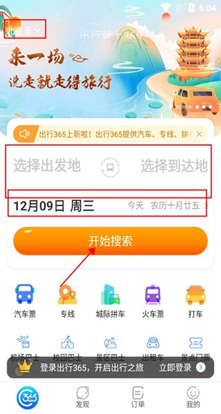 1、出行365汽车票预订,打开软件进入首界面,你可以在这里购买火车票、汽车票等;