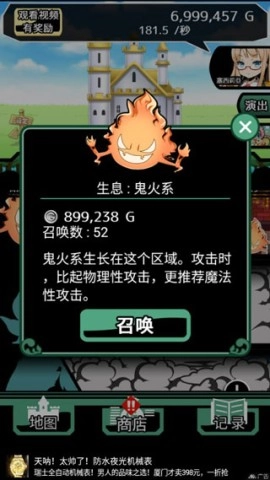 2、玩法简单易懂,可以概括为四个部分:搜索金币、解锁场景、升级怪物和击退魔王。