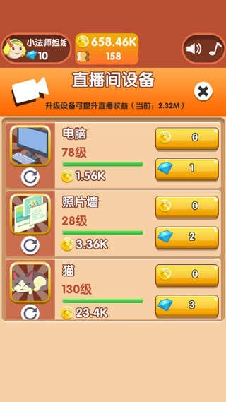 解锁并升级直播间设备,能为你带来可观的直播收益,而且部分设备达到特定等级后还可以进行更换。