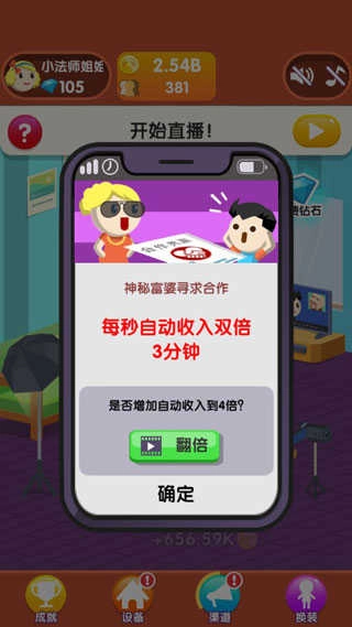这款游戏的玩法主打轻松休闲,你在游戏里将化身一名主播,通过直播有趣的话题来提升自身知名度,与此同时,还得管理粉丝打赏、装扮直播间,以此获取收入;为了更快出名,你需要开启不同的营销手段吸引流量,引进更优质的直播设备,逐步扩张并壮大自己的实力。而直播的最终目标是赚取收益,增加收益的方式主要分为以下几类: