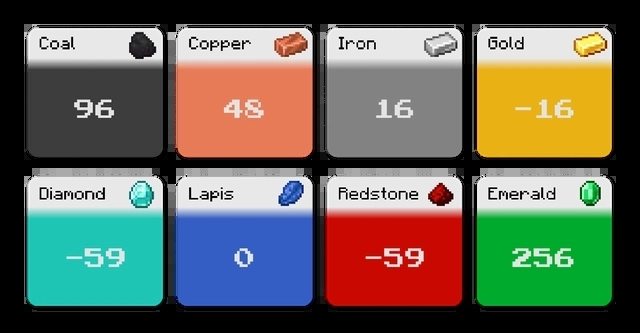 1、矿石分布;这是一张简洁的图表,呈现了自1.21版本“洞穴与山崖”更新对地形、群系及建筑高度进行重塑后,《我的世界》中所有矿石在Y轴坐标上的最优分布位置。从图中可以清楚看到:煤炭的最佳挖掘层是96层,铜矿石在48层,铁矿石位于16层,金矿石在-16层,钻石和红石的最佳层均为-59层,青金石在0层,绿宝石则在256层。因此,对于热衷于挖掘钻石的玩家来说,操作很简单——只要挖到地底,就能尽情地推进挖掘进度了。