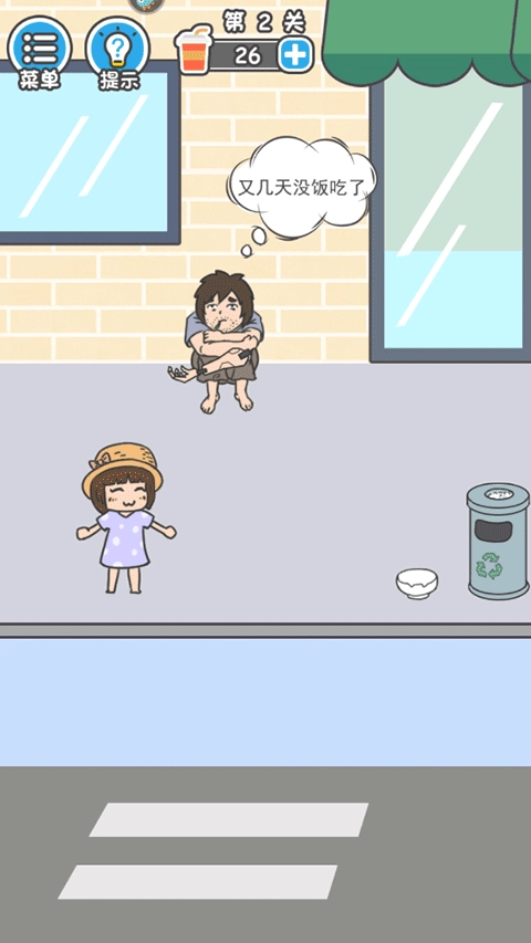 2、捡起路边的碗,拖动到乞丐身上,就会有路人给他施舍一点钱,这样就通关成功了。