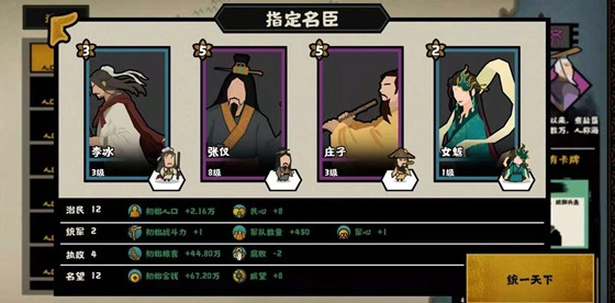 这些名臣获取难度较低,性价比高。李冰、庄子和女魃的技能能够有效提升民心值,而高民心会带来显著的加成效果。李冰和庄子对军事能力有所增强,并且负面效果较少。张仪作为春秋时期的神级卡牌,在开局阶段能为玩家争取更多发展时间以及进攻优势。