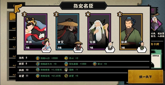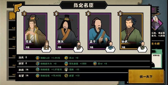 核心组合由张仪、范蠡与孟子构成,三人的技能能够形成良好的配合。张仪具备提升与其他国家好感度的能力,在游戏前期适合通过频繁结盟来积累优势。范蠡和孟子的技能则分别对金钱与粮食的产量提升有帮助。孙武在出征获胜后可以获得威望值,当威望值达到70以上时,还能进一步触发范蠡和张仪的技能效果,从而强化军队的战斗实力以及间谍的等级。