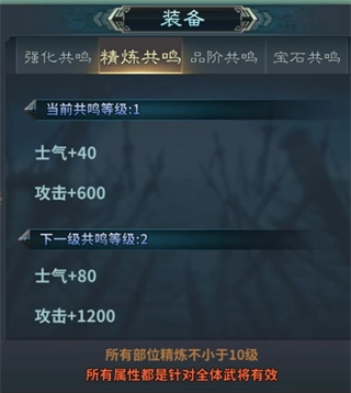 2、精炼:装备可通过金油进行精炼,精炼石的获取途径包括一夫当关玩法、商店购买、充值礼包、寻宝充值商店等;当所有装备的精炼等级每共同提升5级时,就能解锁一个共鸣等级,精炼共鸣带来的属性加成是士气与攻击的提升,且该加成会随共鸣等级的提高而增强。