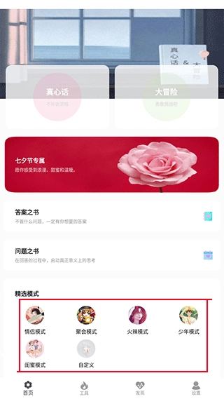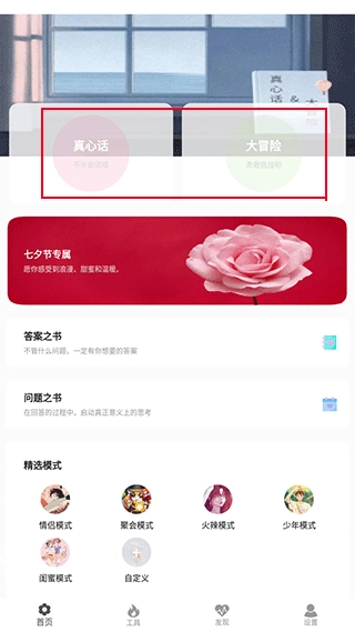 1、真心话大冒险:涵盖情侣、聚会、火辣、少年闺蜜等丰富模式。