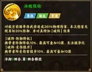 最后核心神将·马云禄能够在队友的守护下,凭借一技能【冰魄银枪】所附带的【破阵】效果,不断叠加减防与增伤状态,从而一举冲破敌军的防线。