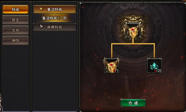 合成系统可通过游戏右下方的“合成”入口进入。该系统初始包含四部分内容,分别为特戒、异宝、生肖和神饰。