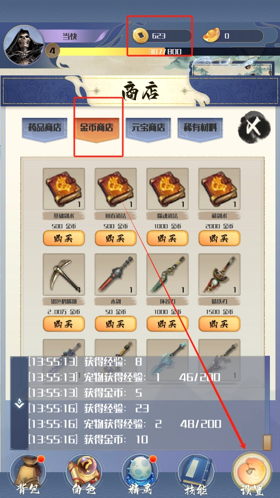 4、刷怪获得的金币可以用在金币商店购买东西