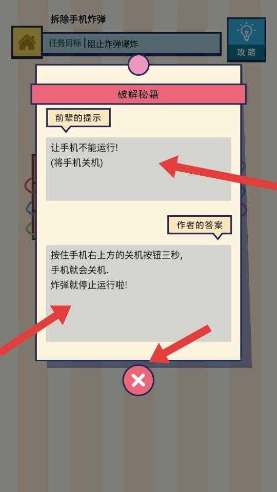 4、按照攻略的提示,若想让手机无法运行,只需按住手机右上方的关机键三秒钟,待手机关机后,炸弹便会停止运作,这样就能完成拆弹操作了。