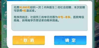 (2)名校招聘的方式其实更适合在医院发展早期采用,原因在于医院等级越高,通过名校招聘所需投入的费用就会越高;采用名校招聘,主要是为了吸纳“硕士”学位且临床职称为“住院医师”的医生,在医院达到二级丙等资质之前,最好每个科室都配备两名这样的医生——他们会作为我们的重点培养对象,一旦这些医生即将参加临床职称考试,就会对其开展全方位的培养,一路支持他们晋升至主任医师;之所以不招聘博士和博士后,是因为博士的最低临床职称是“主治医师”,博士后的最低临床职称是“副主任医师”,而在游戏设定里,主任医师的初始临床职称越低,对应的月薪就越低,这能在很大程度上帮助医院节约成本。