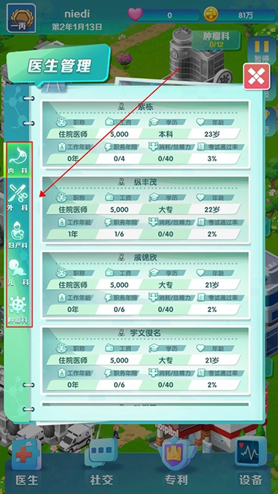 1、游戏内设有内科、外科、妇产科、儿科、肿瘤科五种医生类型,玩家能够针对各科室招聘医生,以此扩充医院的人员配置。