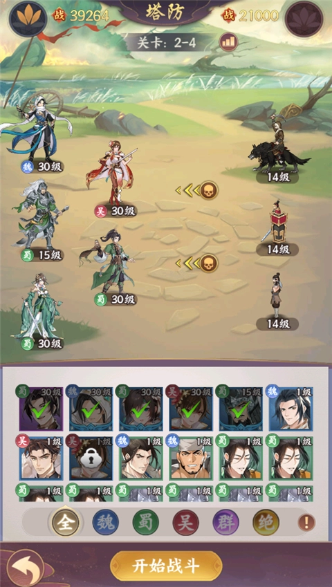 4、选择闯关并点击它,搭配我们的阵容,可拖动角色放置
