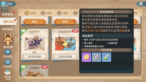 荣光竞技场是一项跨服PVP玩法,每日开放时段为12点至13点,以及20点至22点(该时段奖励为双倍)。参与活动可获取徽章奖励,且每周的徽章获取数量设有上限。此外,每天参与的前两场战斗会提供额外奖励。若想更高效地达成每周徽章上限,建议选择每日20点至22点的时段参与活动。