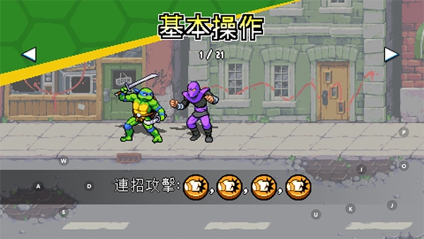 《忍者神龟:施莱德的复仇》安卓版是一款以忍者神龟为主题的街机风格格斗动作游戏,复古的美漫画风将带领玩家踏入那个黑恶势力横行、神龟们坚守正义的世界!在游戏中,玩家可以化身为拉斐尔、李奥纳多、米开朗基罗、多纳泰罗等角色,手持钢爪、鞭子、弹弓、武士刀等武器,与挥舞斧子、弓箭、十手、单刀、长枪的忍者们展开生死对决。 作为一款经典的街机游戏,它十分考验玩家对普通攻击、角色必杀技、跳跃、翻滚等操作的组合运用——不同的按键顺序能触发截然不同的华丽连招。此外,游戏还支持多人本地同屏联机,快叫上好友一起,在曼哈顿的街头与穷凶极恶的罪犯们展开热血搏斗吧!