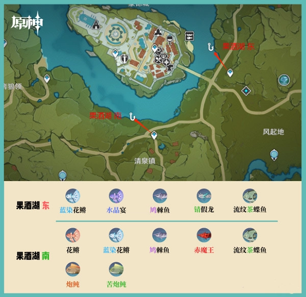 在果酒湖南面可以钓到的鱼类包括:花鱂、蓝染花鱂、鸠棘鱼、赤魔王、流纹茶蝶鱼、炮鲀以及苦炮鲀。(具体的钓鱼位置可参考下图)