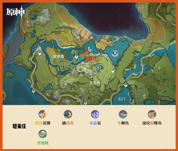 璃月的钓鱼地点一共有七个,依次是:轻策庄、望舒客栈、归离原、奥藏山、琥牢山、渌华池和天遒谷。