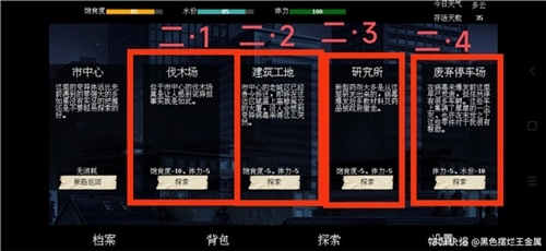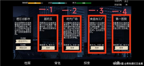 可探索的区域包括:普通地图中的“流浪者营地”“居民区”“时代广场”“食品加工厂”“第一医院”“伐木场”“建筑工地”“研究所”以及“废弃停车场”。