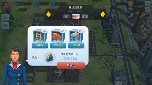 玩家点进机场后,就可以发现可以通过向3个城市发货来获取高级材料,分别是东京、巴黎和伦敦。它的具体玩法也和货运港口类似: