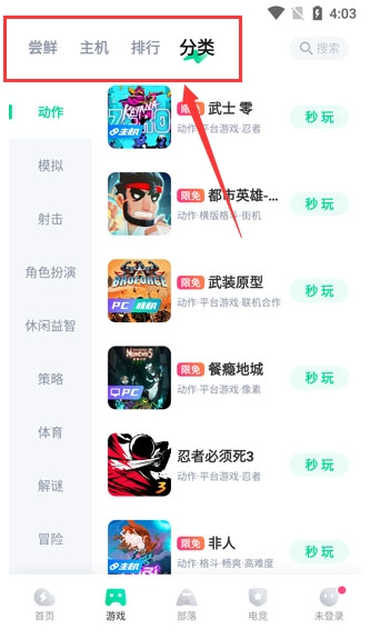 2、可以选择分类,进入游戏的分类专区;也可以选择排行,查看游戏的各类排名。