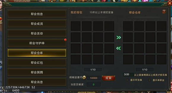 玩家能够把等级达到60级及以上的装备存进帮会仓库,以此获取帮会贡献度,并且还可以使用这些贡献度领取自己需要的装备!